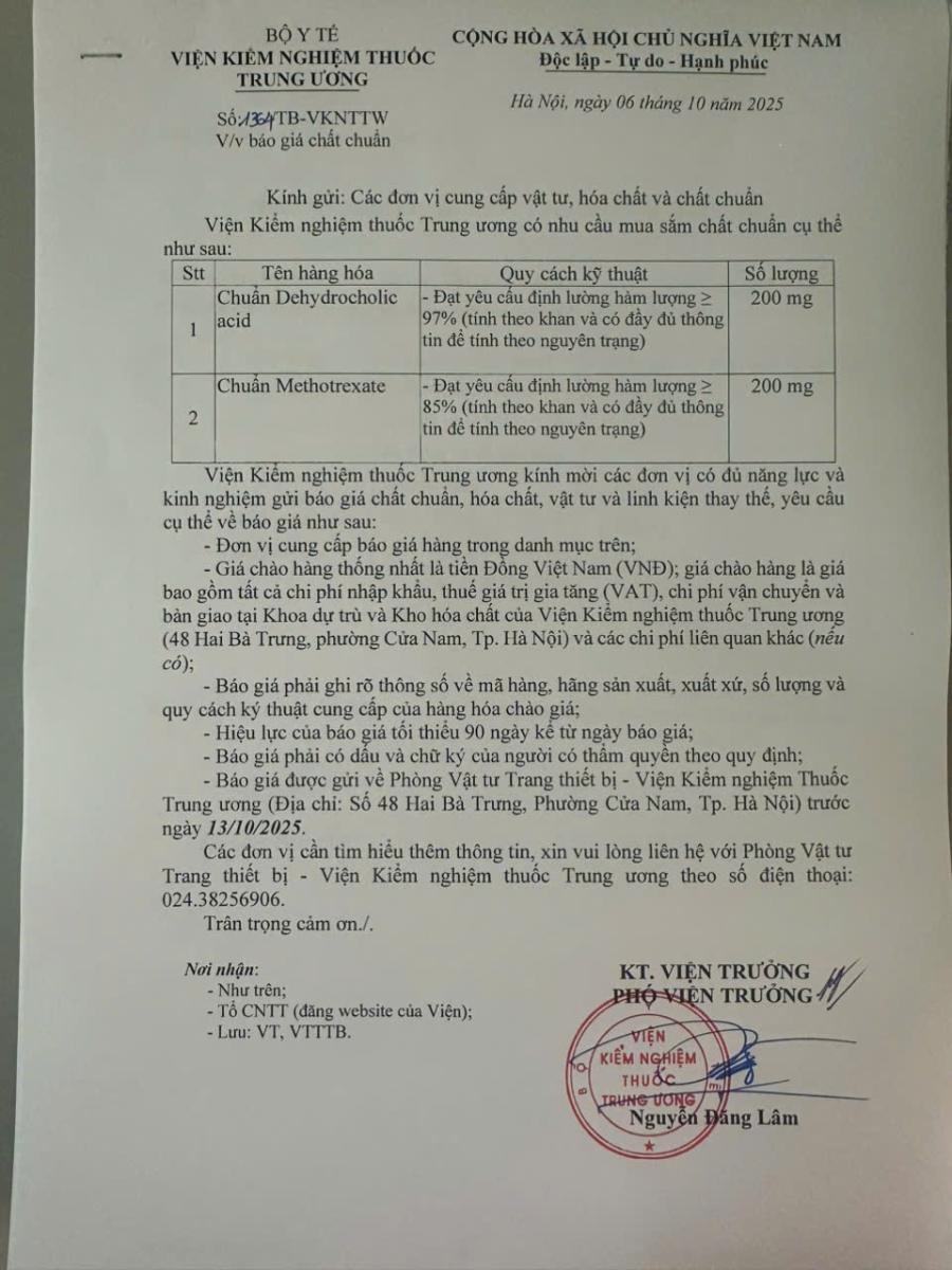 Thông báo mời báo giá chất chuẩn của Viện Kiểm nghiệm thuốc Trung ương