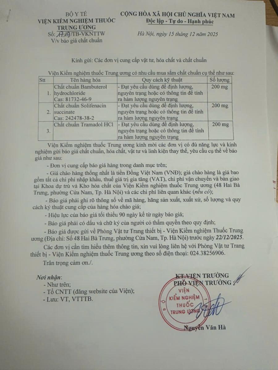 x 15/12/2025Viện Kiểm nghiệm Thuốc Trung ương đang có nhu cầu xin báo giá chất chuẩn.