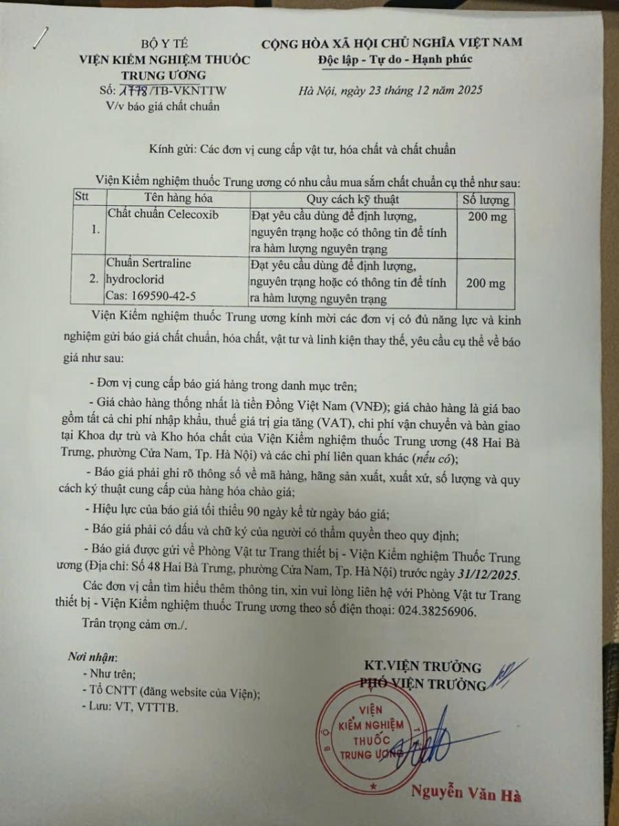 x 23/12/2025Viện Kiểm nghiệm Thuốc Trung ương đang có nhu cầu xin báo giá chất chuẩn.