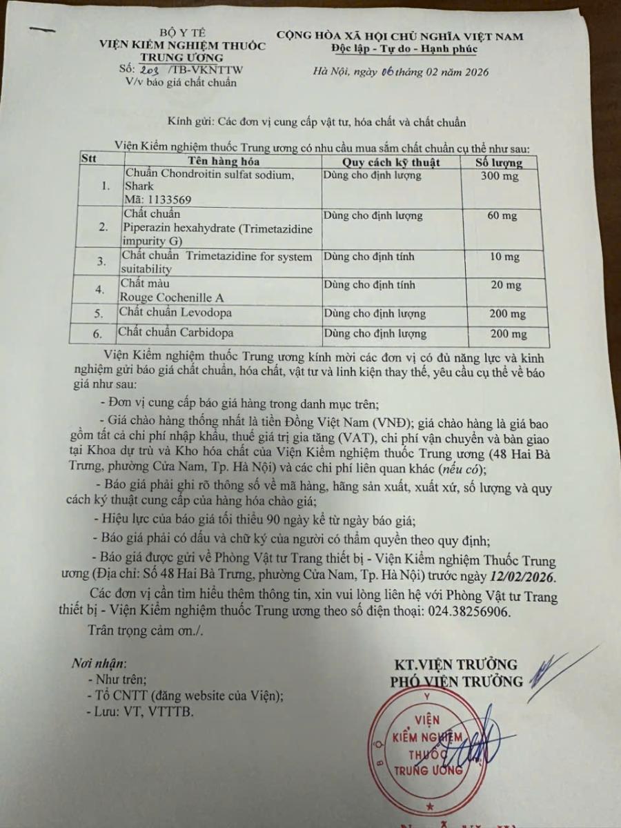 x 06/02/2026Viện Kiểm nghiệm Thuốc Trung ương đang có nhu cầu xin báo giá chất chuẩn.