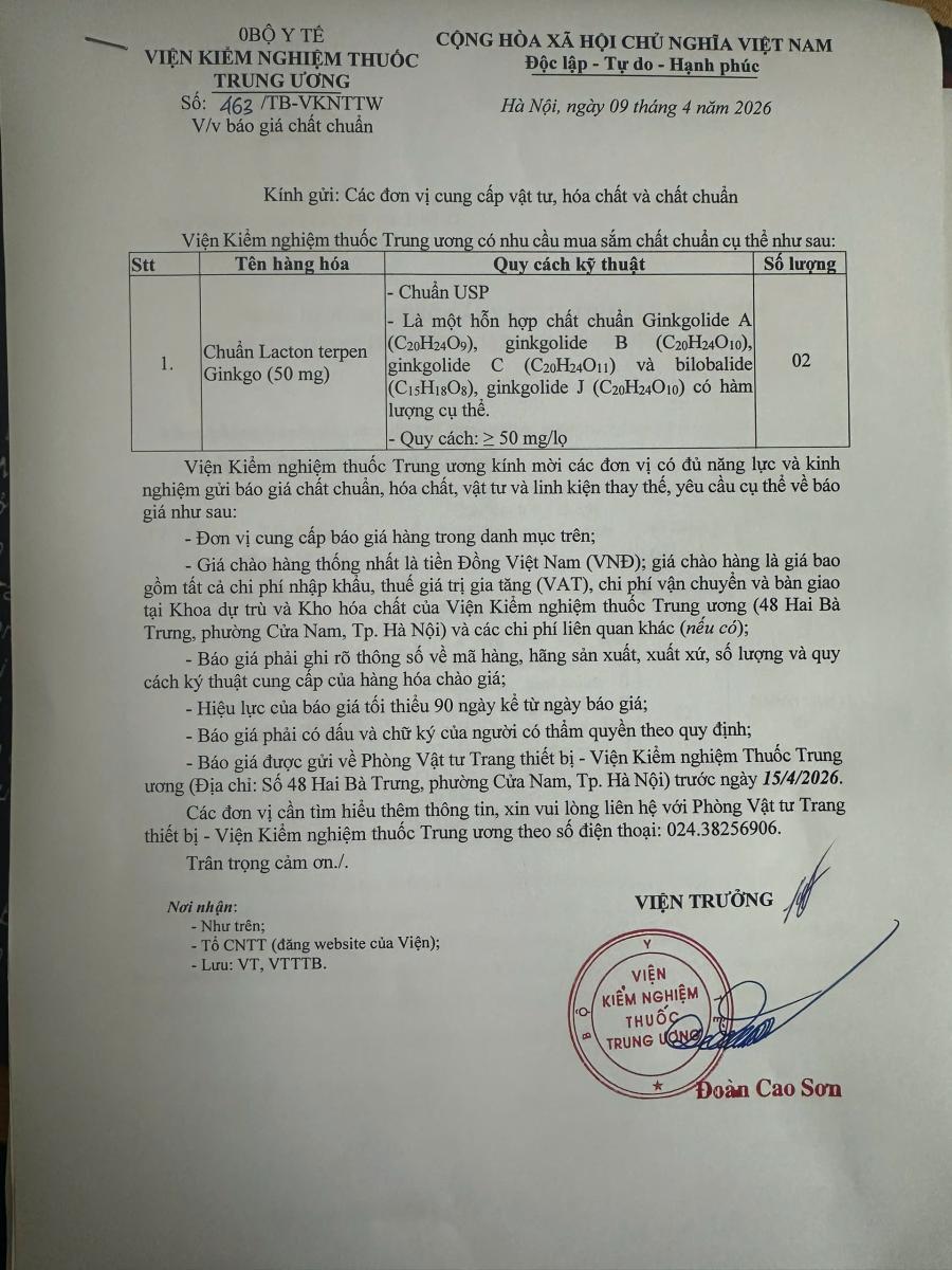 x 09/04/2026Viện Kiểm nghiệm Thuốc Trung ương đang có nhu cầu xin báo giá chất chuẩn.
