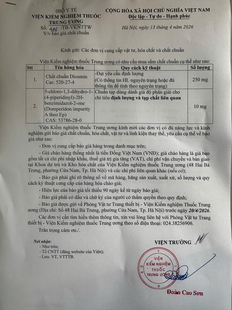 x 13/04/2026Viện Kiểm nghiệm Thuốc Trung ương đang có nhu cầu xin báo giá chất chuẩn.