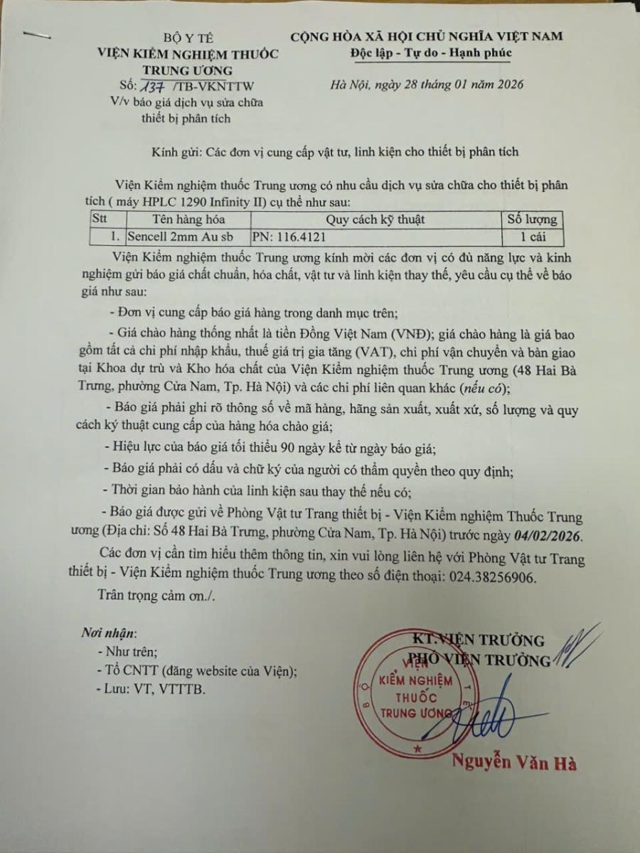 Viện Kiểm nghiệm Thuốc Trung ương đang có nhu cầu xin báo giá dịch vụ sửa chữa thiết bị.