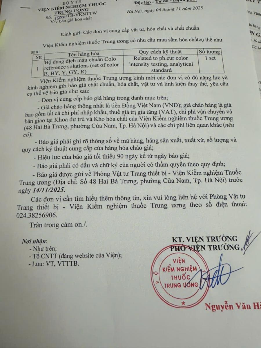x 06/11/2025Viện Kiểm nghiệm Thuốc Trung ương đang có nhu cầu xin báo giá hóa chất .