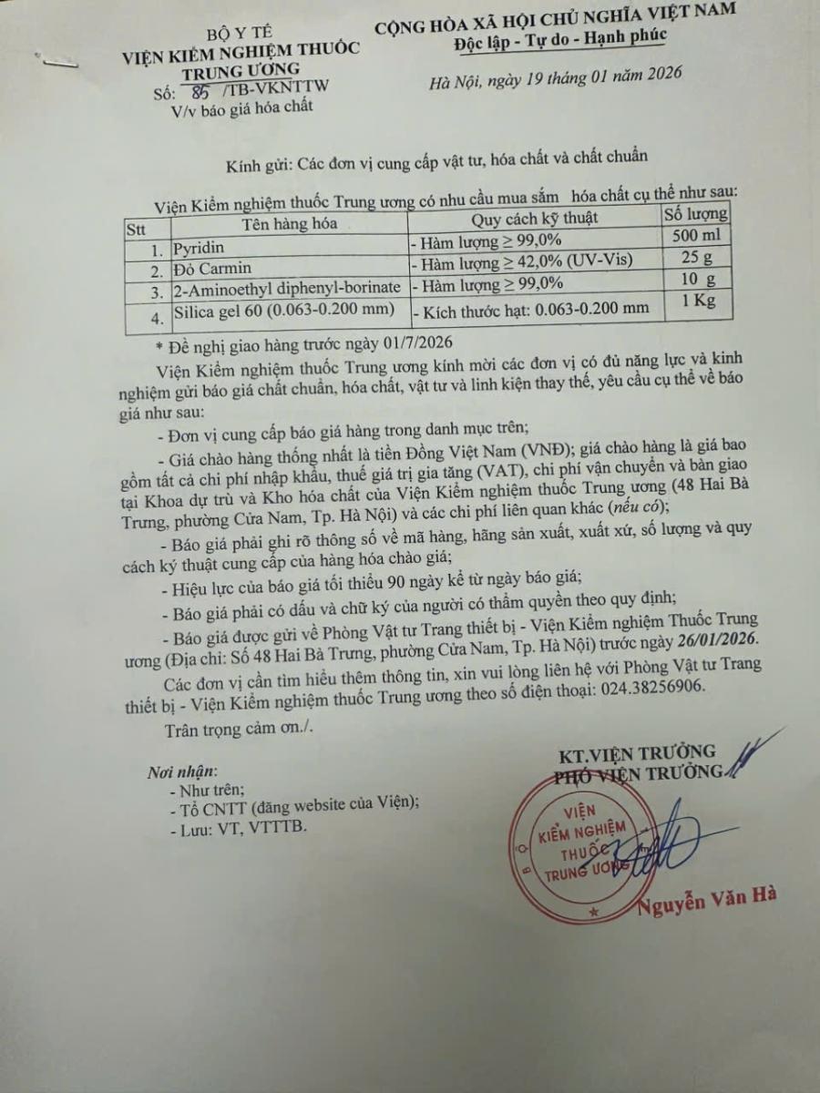 x 19/01/2026Viện Kiểm nghiệm Thuốc Trung ương đang có nhu cầu xin báo giá hóa chất .