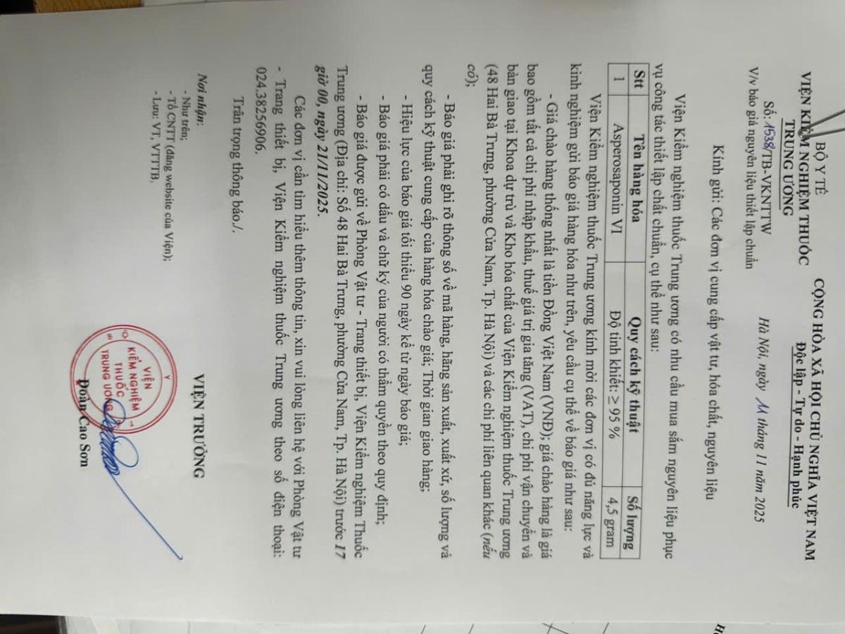 Thông báo mời báo giá nguyên liệu thiết lập chất chuẩn của Viện Kiểm nghiệm thuốc Trung ương