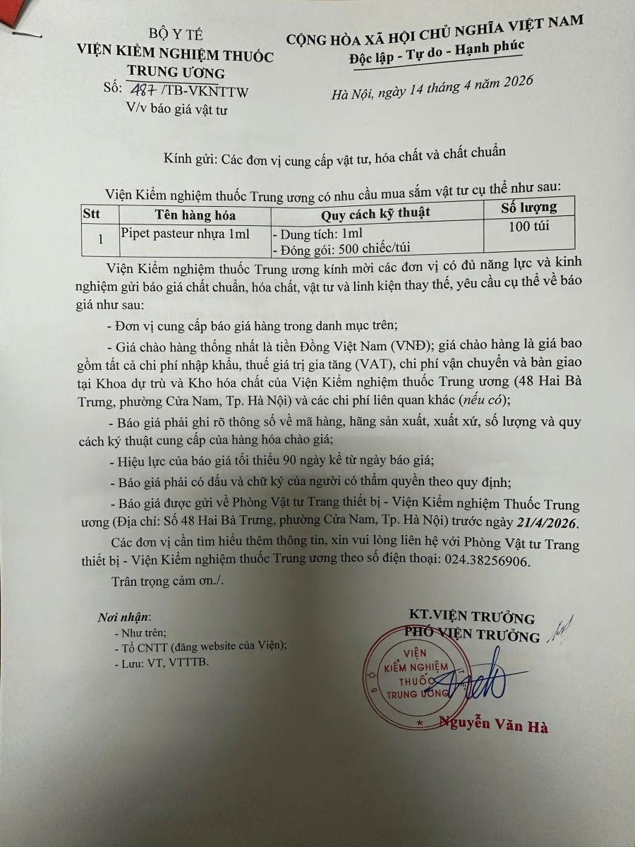 Thông báo mời báo giá vật tư của Viện Kiểm nghiệm thuốc Trung ương