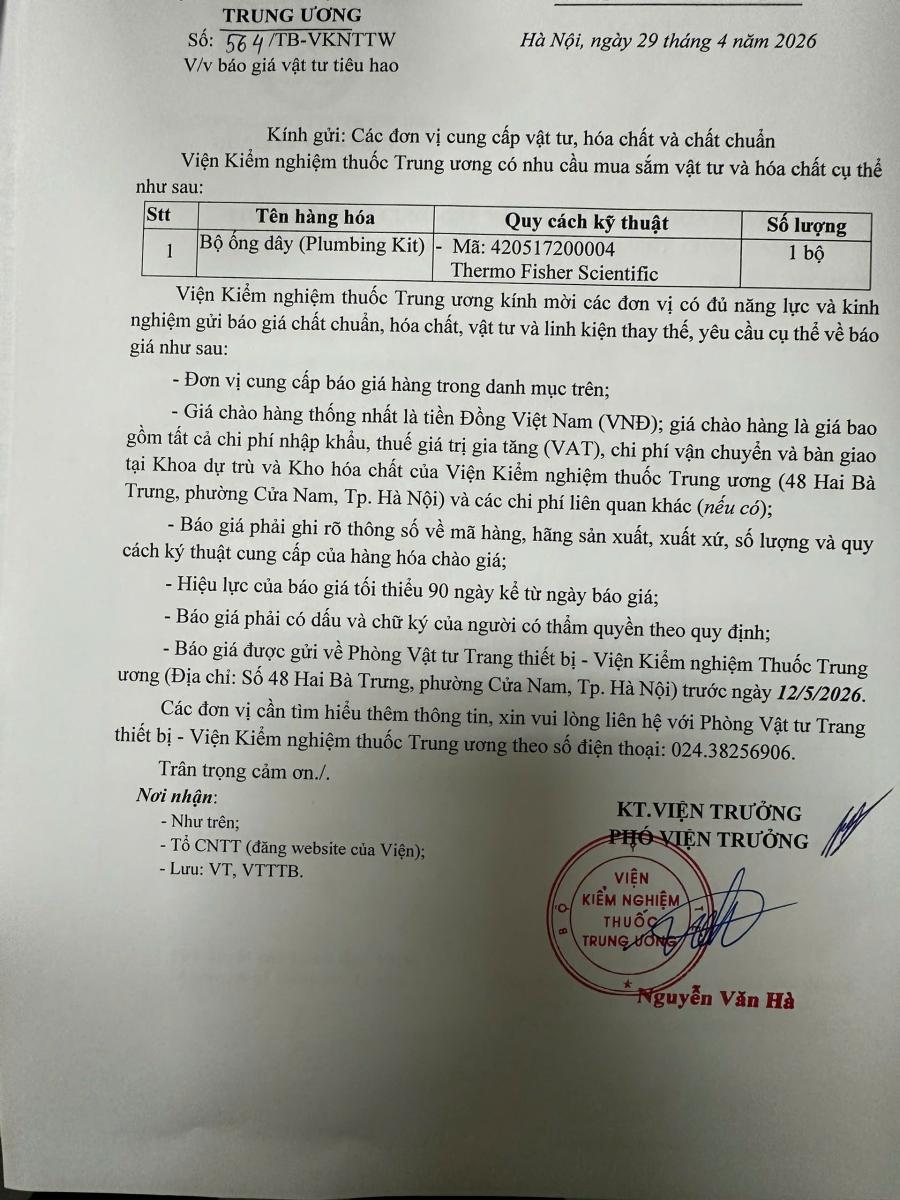 x 29/04/2026Viện Kiểm nghiệm Thuốc Trung ương đang có nhu cầu xin báo giá vật tư tiêu hao.