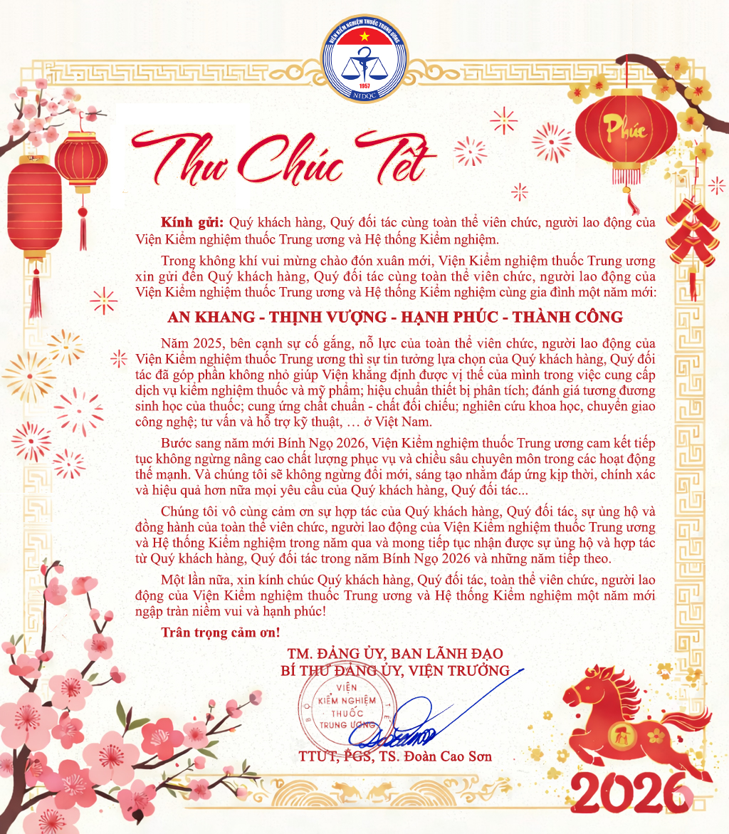 Công bố công khai tài sản công năm 2025 của Viện Kiểm nghiệm thuốc Trung ương x 11/02/2026 Thư chúc tết xuân Bính Ngọ 2026 Thông báo Phát hành sách điện tử “Dược thư quốc gia Việt Nam lần xuất bản thứ ba” Thông báo mời báo giá chất chuẩn của Viện Kiểm nghiệm thuốc Trung ương Thông báo mời báo giá chất chuẩn của Viện Kiểm nghiệm thuốc Trung ương Thông báo mời báo giá vật tư của Viện Kiểm nghiệm thuốc Trung ương