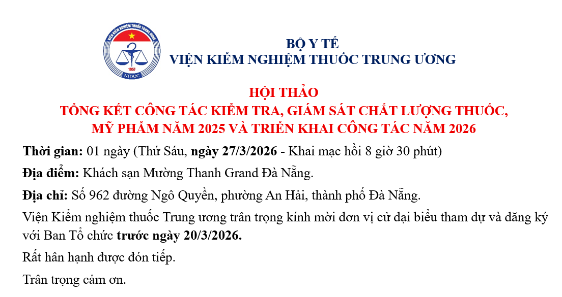 THÔNG BÁO: HỘI NGHỊ KIỂM NGHIỆM 2026 x 03/03/2026 Viện Kiểm nghiệm thuốc Trung ương tổ chức Hội thảo “Tổng kết công tác kiểm tra, giám sát chất lượng thuốc, mỹ phẩm năm 2025 và triển khai công tác năm 2026”