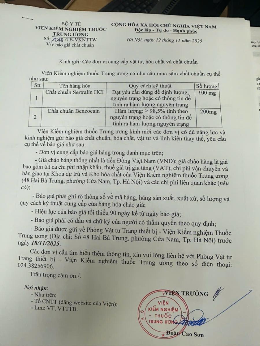x 12/11/2025Viện Kiểm nghiệm Thuốc Trung ương đang có nhu cầu xin báo giá chất chuẩn.