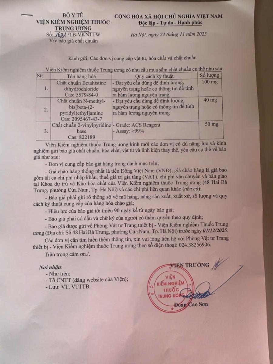 x 24/11/2025Viện Kiểm nghiệm Thuốc Trung ương đang có nhu cầu xin báo giá chất chuẩn.