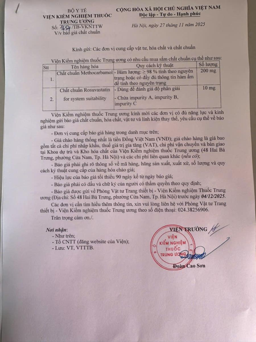 x 27/11/2025Viện Kiểm nghiệm Thuốc Trung ương đang có nhu cầu xin báo giá chất chuẩn.