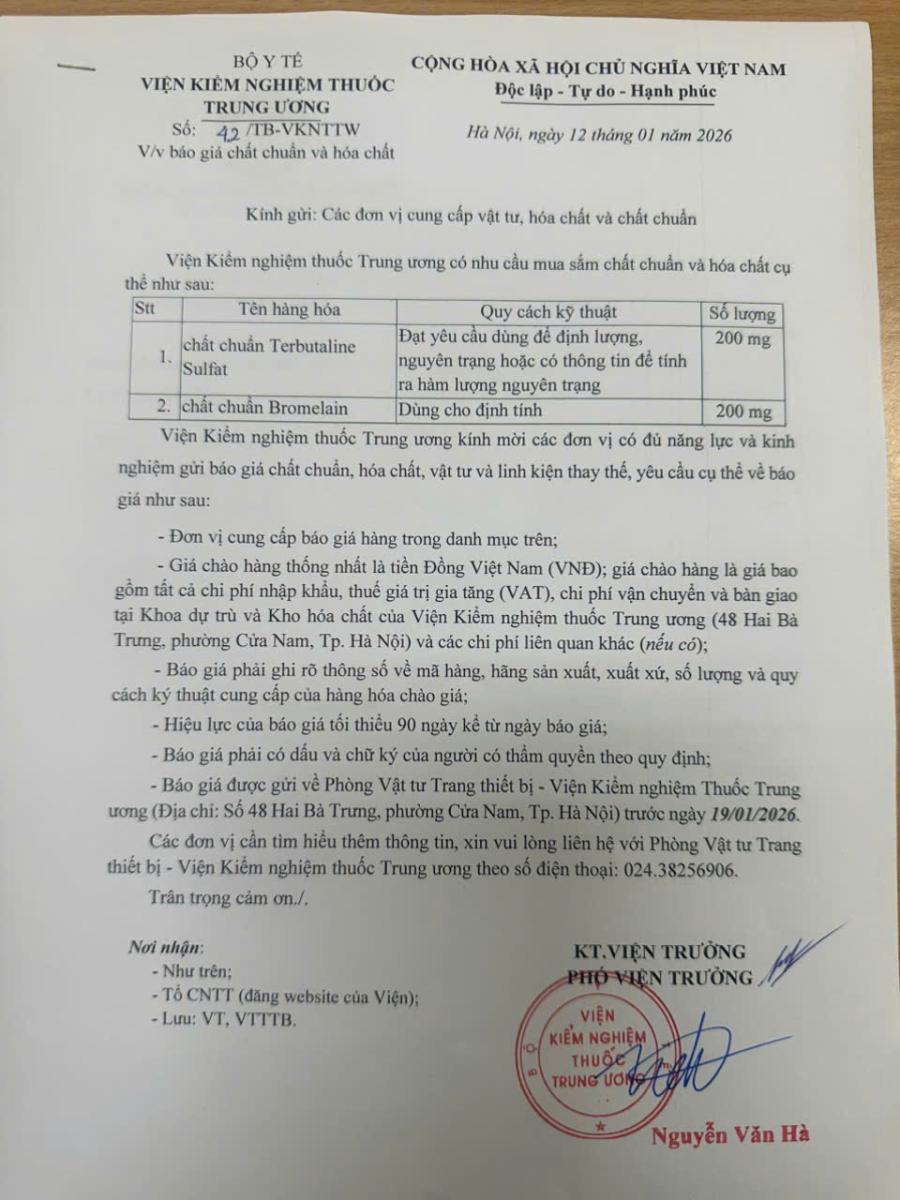 Thông báo mời báo giá chất chuẩn của Viện Kiểm nghiệm thuốc Trung ương