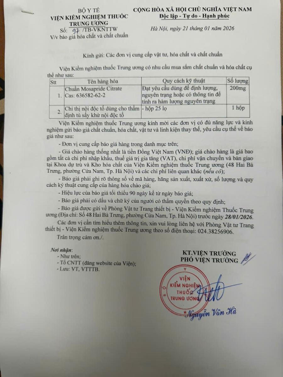 Thông báo mời báo giá chất chuẩn và hóa chất của Viện Kiểm nghiệm thuốc Trung ương