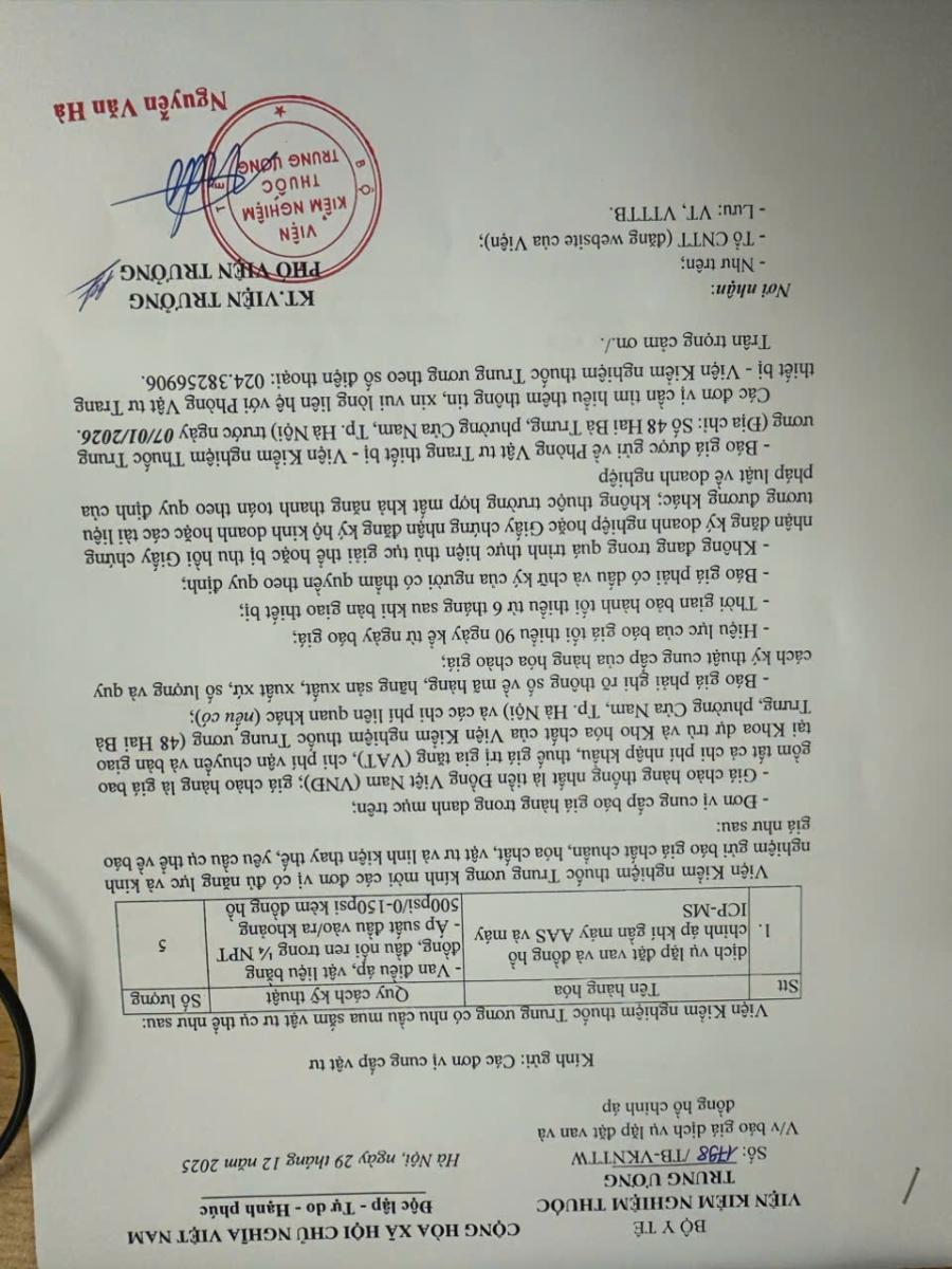 x 29/12/2025Viện Kiểm nghiệm Thuốc Trung ương đang có nhu cầu xin báo giá Dịch vụ lắp đặt van và đồng hồ chỉnh áp.