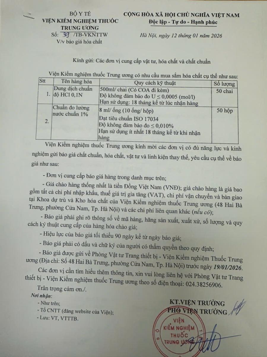 Thông báo mời báo giá hóa chất của Viện Kiểm nghiệm thuốc Trung ương