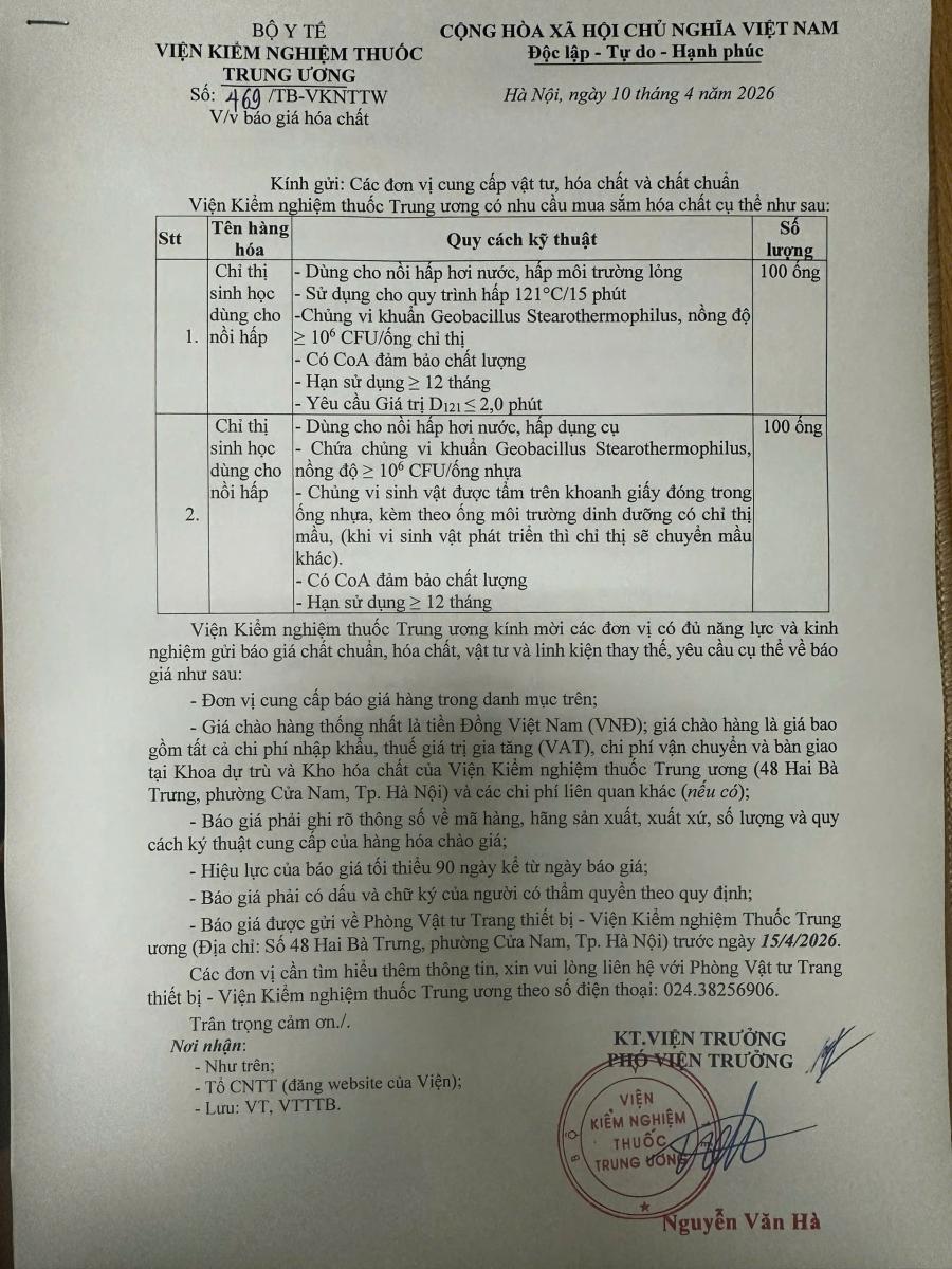 x 10/04/2026Viện Kiểm nghiệm Thuốc Trung ương đang có nhu cầu xin báo giá hóa chất .