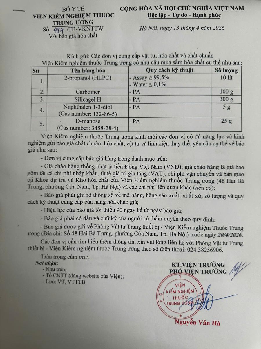 x 13/04/2026Viện Kiểm nghiệm Thuốc Trung ương đang có nhu cầu xin báo giá hóa chất .