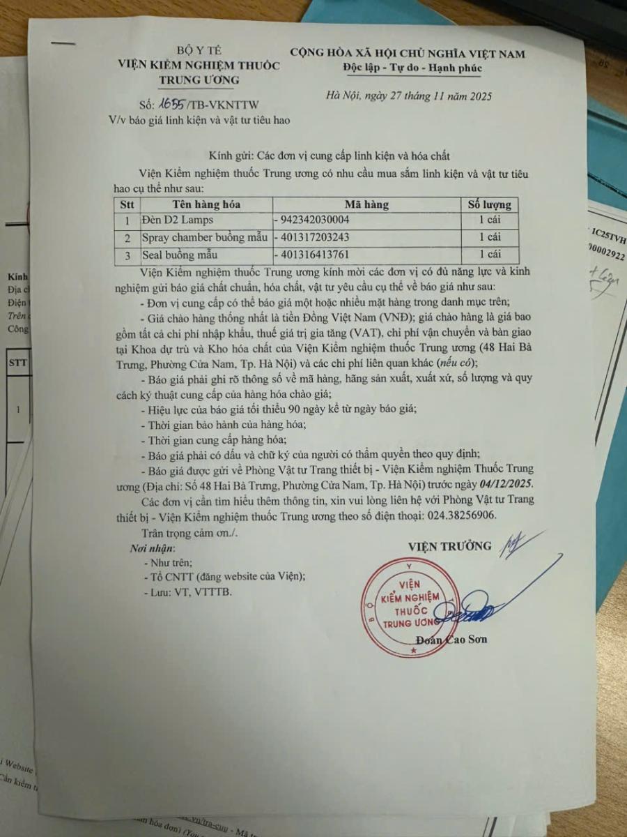 Thông báo mời báo giá linh kiện thay thế của Viện Kiểm nghiệm thuốc Trung ương