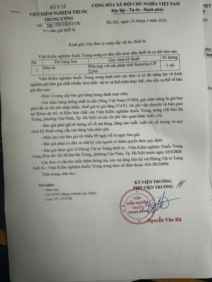 Thông báo mời báo giá thiết bị của Viện Kiểm nghiệm thuốc Trung ương