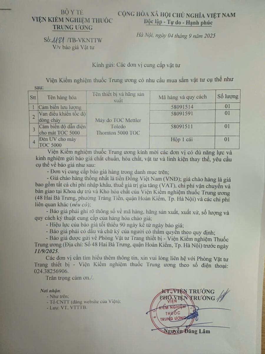 x 04/09/2025Viện Kiểm nghiệm Thuốc Trung ương đang có nhu cầu xin báo giá vật tư.