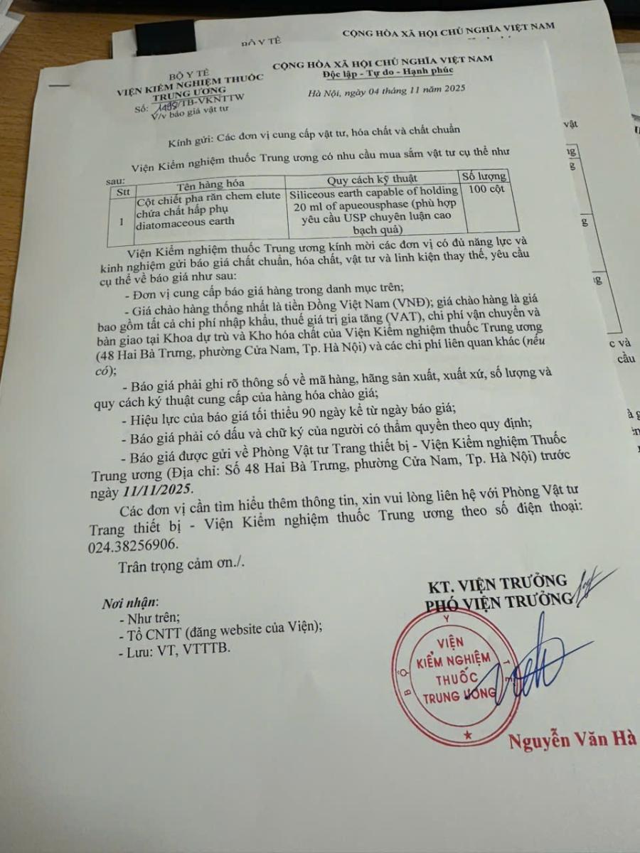 x 06/11/2025Viện Kiểm nghiệm Thuốc Trung ương đang có nhu cầu xin báo giá vật tư.