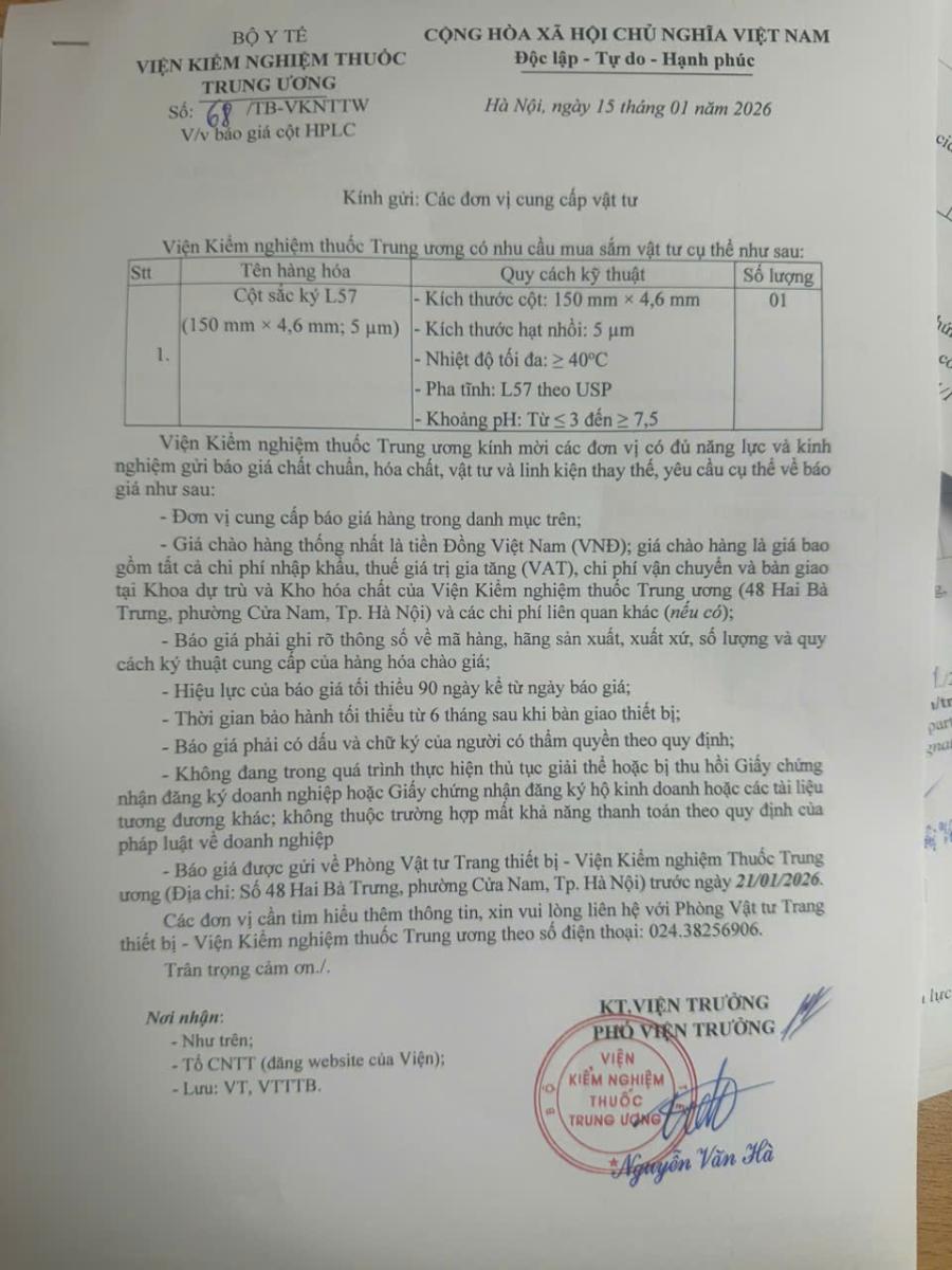 x 15/01/2026Viện Kiểm nghiệm Thuốc Trung ương đang có nhu cầu xin báo giá vật tư.