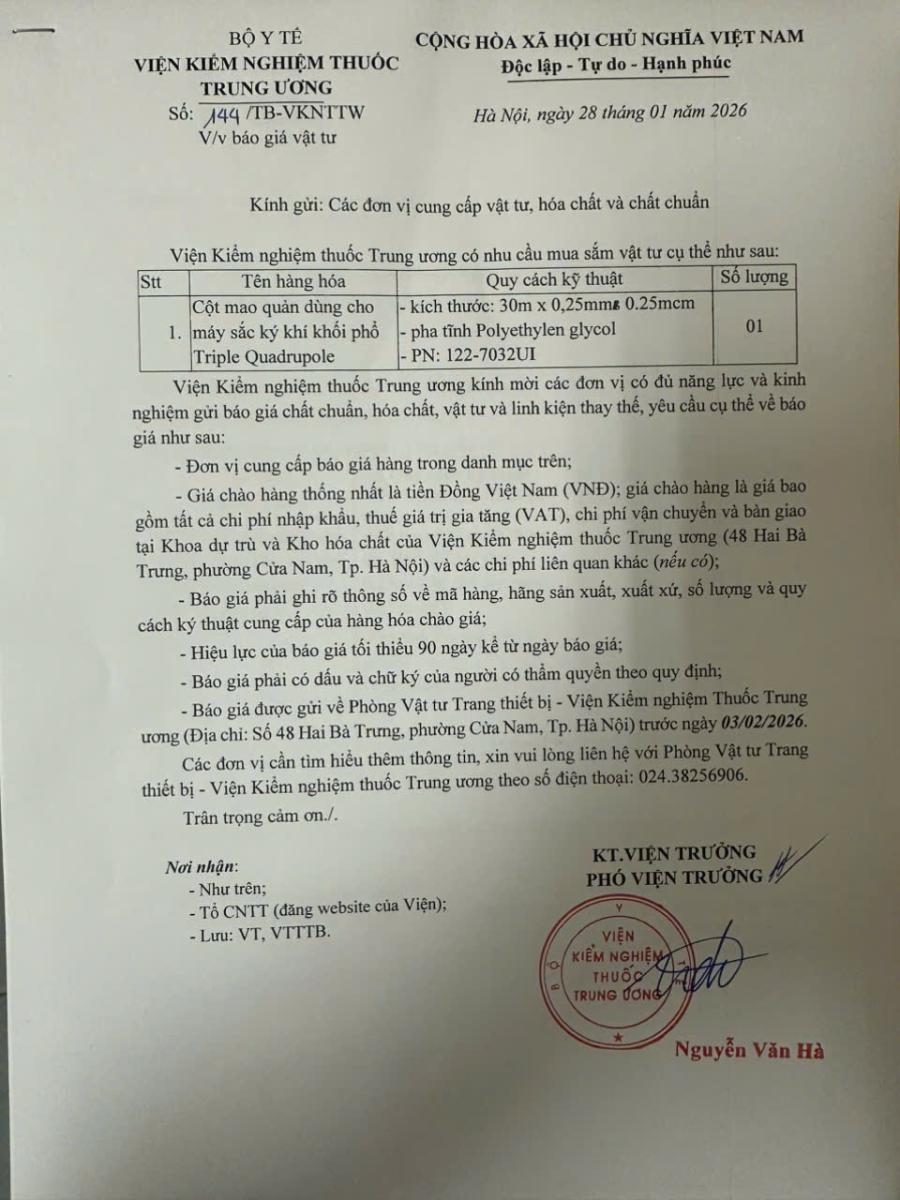 x 28/01/2026Viện Kiểm nghiệm Thuốc Trung ương đang có nhu cầu xin báo giá vật tư.