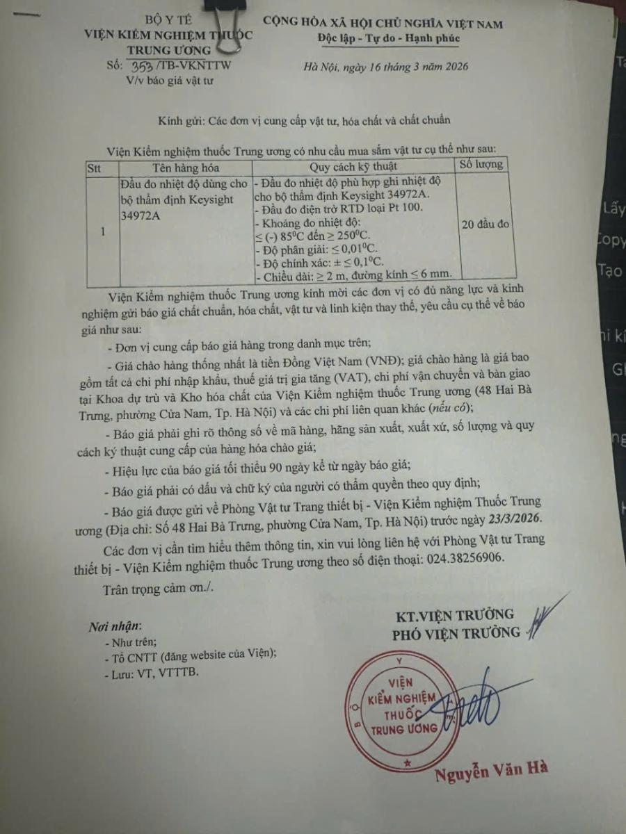 x 16/03/2026Viện Kiểm nghiệm Thuốc Trung ương đang có nhu cầu xin báo giá vật tư.