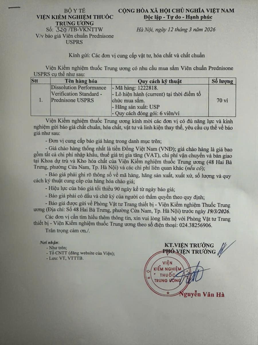 x 12/03/2026Viện Kiểm nghiệm Thuốc Trung ương đang có nhu cầu xin báo giá Viên chuẩn Prednisone USPRS.